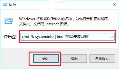 二、打開“運(yùn)行”*作框后,在開孔后面鍵入命令:cmd /k systeminfo | find “初始安裝日期” ,之后點(diǎn)擊下方的“確定”運(yùn)行。