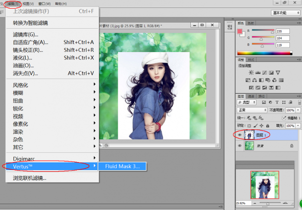 二:用移動(dòng)工具將美女圖片拖到風(fēng)景圖片中。選擇圖層1,然后單擊菜單中的濾鏡→Vertus→Fluid Mask3