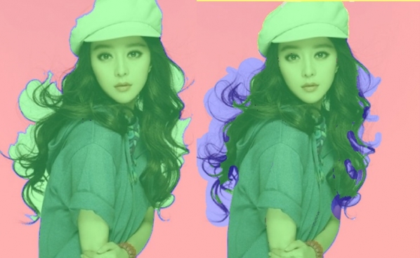 八:用紅筆5在要?jiǎng)h除的區(qū)域涂抹,如左圖所示。筆頭大小可以調(diào)整。用藍(lán)筆7在紅綠交界的區(qū)域涂抹,如右圖所示。筆頭大小可以調(diào)整。