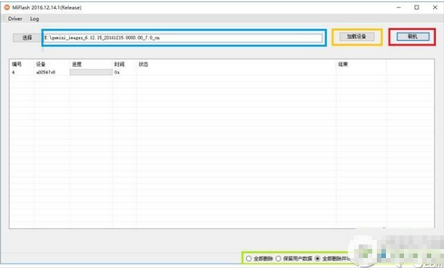 點(diǎn)擊黃色圈選部分加載設(shè)備,刷機(jī)程序會(huì)自動(dòng)識(shí)別手機(jī),點(diǎn)擊紅色圈選部分刷機(jī)開始刷機(jī)。