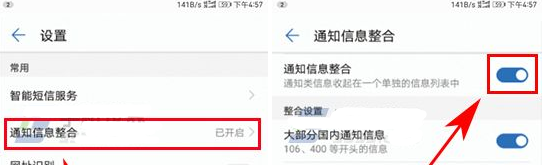 2、接著點(diǎn)擊【通知信息整合】,然后開啟開關(guān)就行了,這樣就能自動(dòng)整合了。