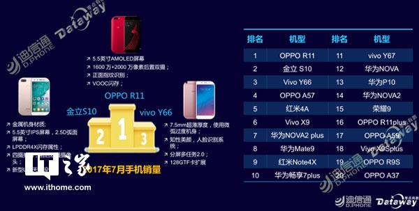 從迪信通公布的數(shù)據(jù)來看,今年7月份,OPPO R11線下表現(xiàn)優(yōu)異,奪得第一。而第二名,則是金立S10,vivo Y66排名第三。