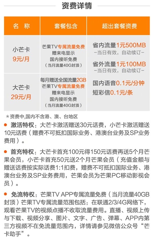 根據(jù)官方公布的資費(fèi)信息,大小芒卡均可享受芒果TV專屬流量免費(fèi)以及來(lái)電顯示和國(guó)內(nèi)接聽免費(fèi),其中小芒卡月租9元起,大芒卡月租29元起,大芒卡每月可獲贈(zèng)2GB全國(guó)流量。
