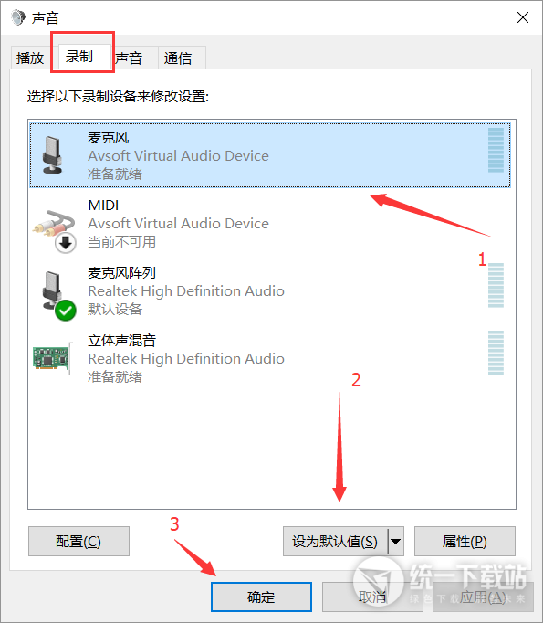 2)在彈出的聲音對話框的錄制標簽內,點擊選中麥克風(Avsoft Virtual Audio Device),然后點擊“設為默認值”>>確定。