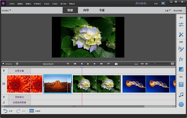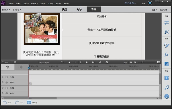 Adobe Premiere Elements 2018 擁有快速、向?qū)Ш蛯<胰N工作模式,通過這三種向?qū)J娇梢砸龑в脩舭错樞蛲瓿梢幌盗胁襟E,從而輕松完成影片的編輯工作,幫助用戶將視頻剪輯變?yōu)榻?jīng)過專業(yè)編輯的影片。