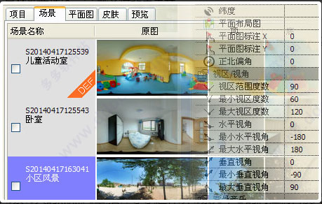 把拼接好的全景攝影圖片拖到場景區(qū),然后拖拽它們以改變順序,再點擊需要編輯的場景,打開它們的屬性,選擇需要的屬性值。